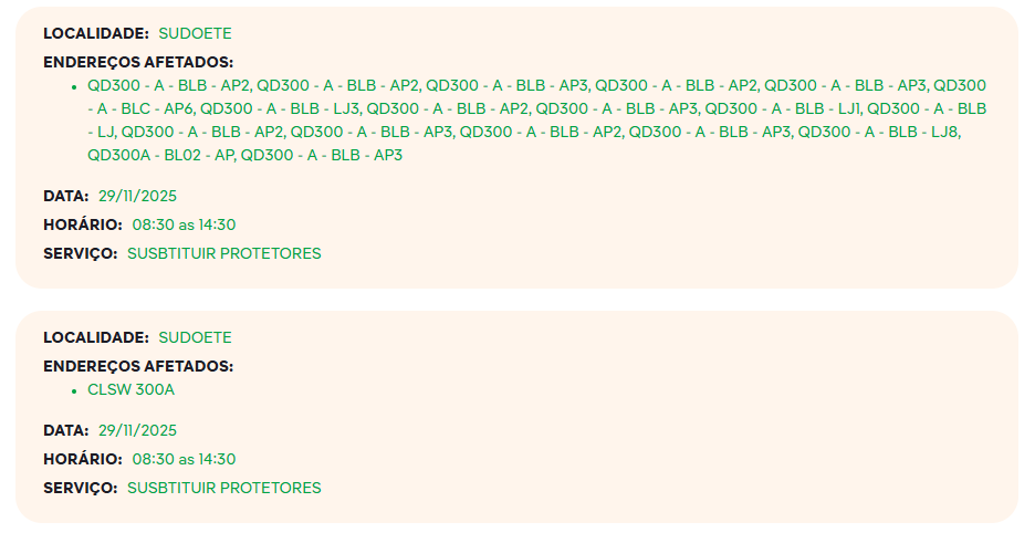 A Neoenergia vai interromper o fornecimento de eletricidade das 8h30 às 14h30 na quadra 300 do Sudoeste, neste sábado (29). É o terceiro desligamento nesta semana, que ocorreu na 104 e 105.