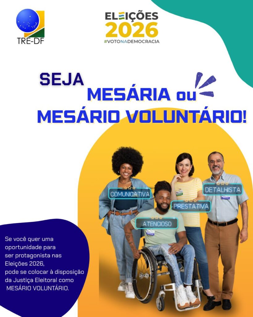 Os mesários têm papel essencial no processo eleitoral. O TRE/DF está com inscrições aberta para ampliar e renovar o banco de mesários voluntários que atuarão nas Eleições Gerais 2026, isso fortalece a transparência do pleito e incentiva a participação cidadã. Todo eleitor com mais de 18 anos pode se inscrever e contribuir diretamente para o fortalecimento da democracia.
